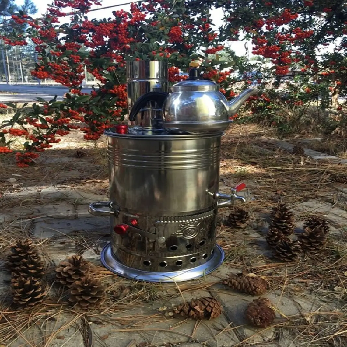 - Paslanmaz çelik krom semaver odun yanan kömür kamp sobası çay su ısıtıcısı açık sofra kamp aksesuarları kahve